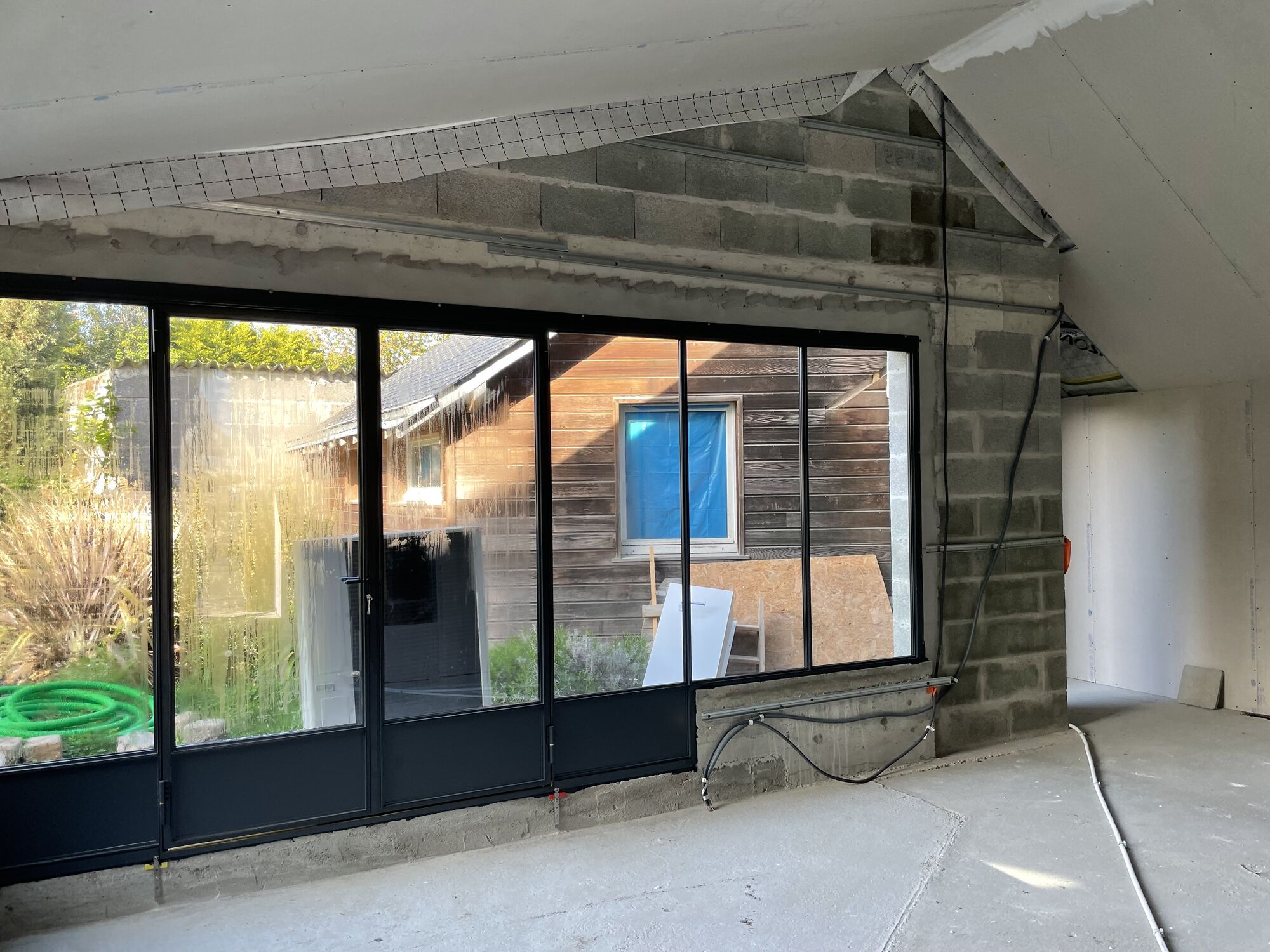 Cette famille souhaitait une extension largement vitrée sur le jardin afin de profiter de l'extérieur. Les baies, en acier, offrent un clair de vitrage important.