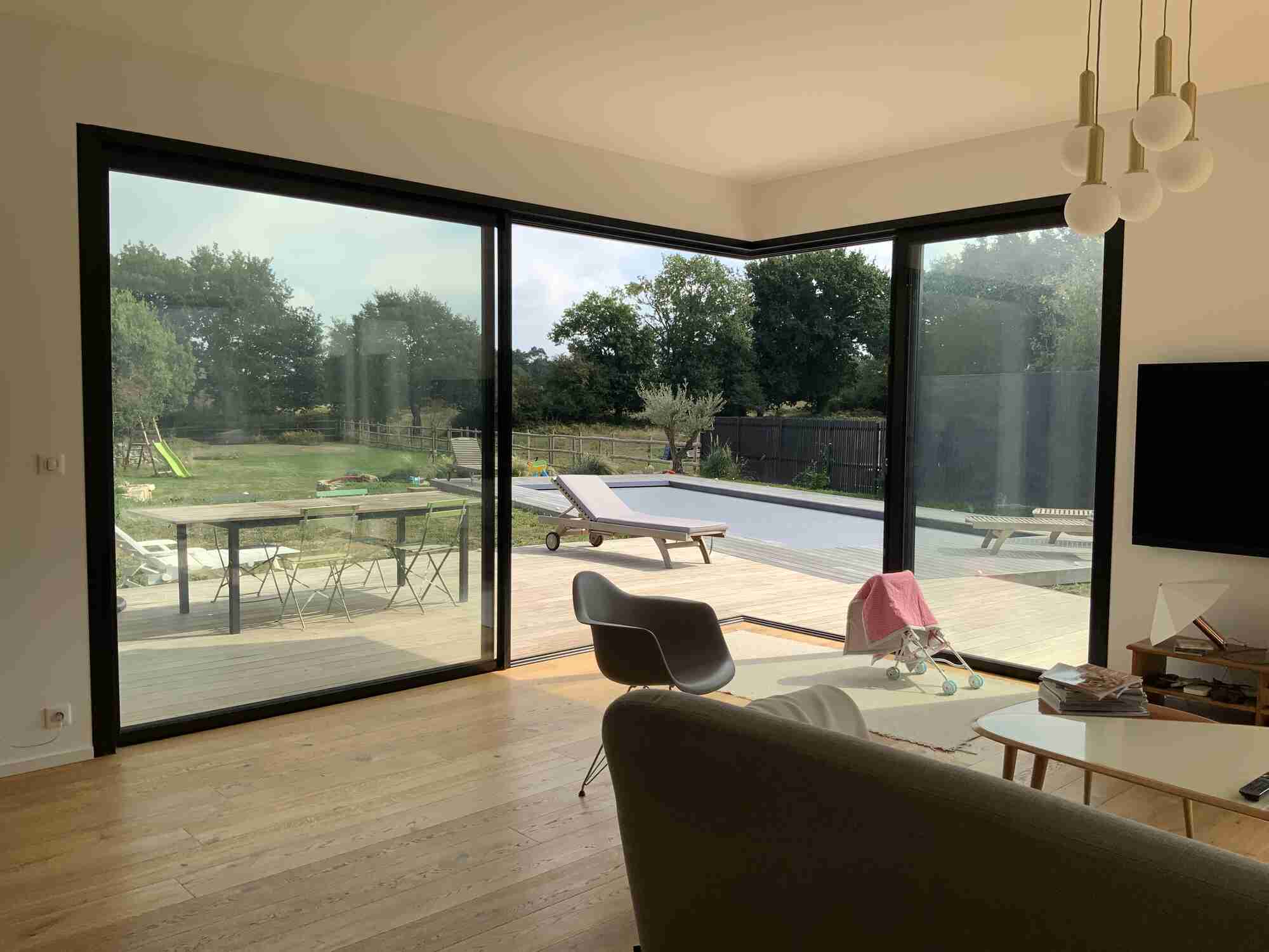 Une extension, au volume épuré, s'accroche à l'angle Sud/Est du bâtiment existant et offre ainsi une orientation multiple. Les larges baies vitrées en angle, sans poteau, apportent lumière et spectacle sur le jardin et sa piscine.