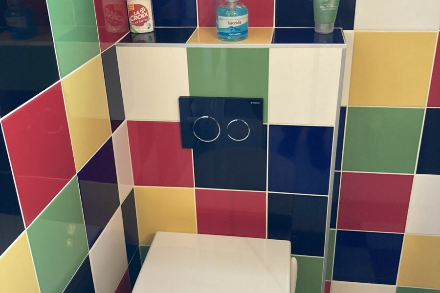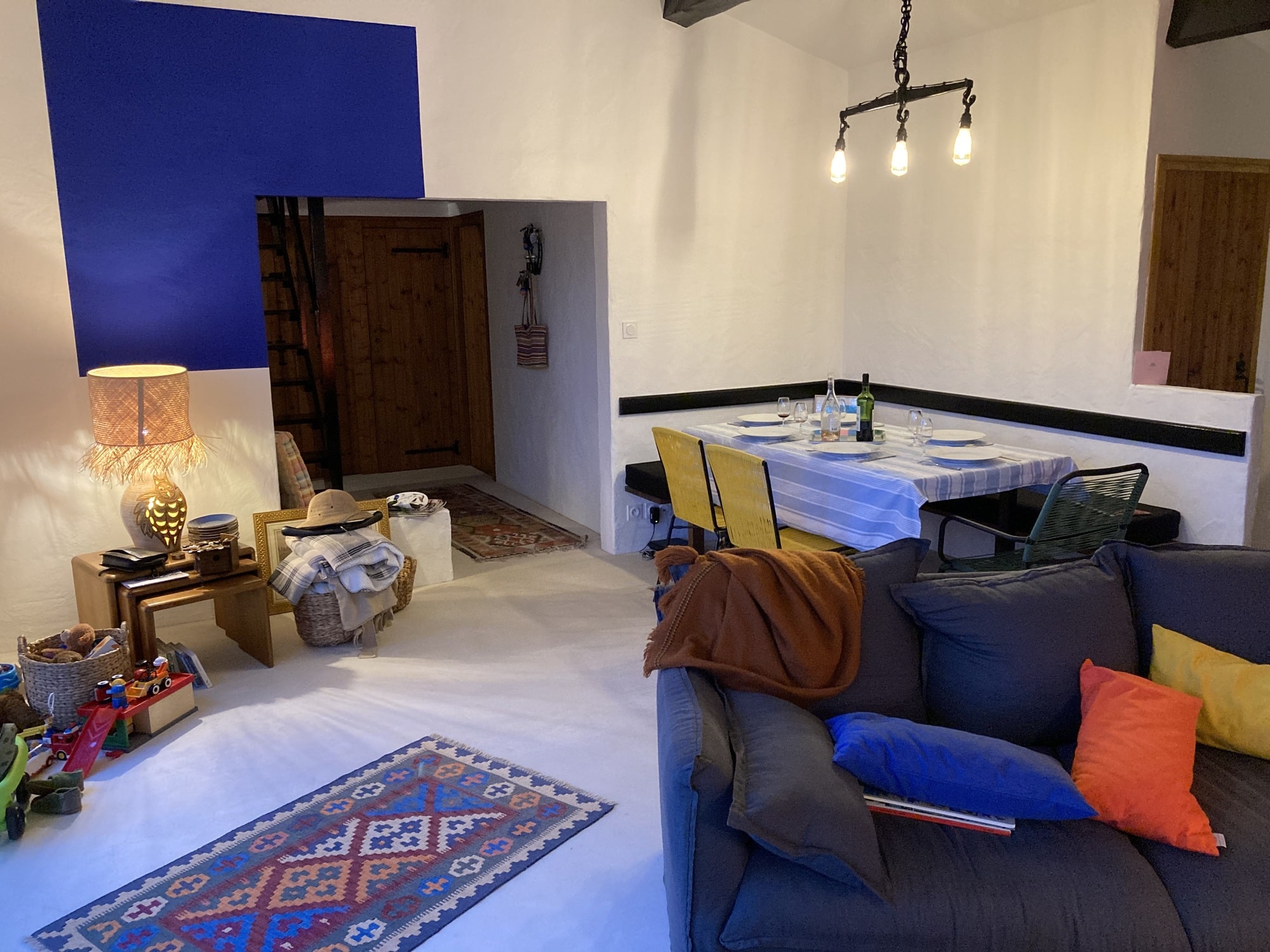 De larges baies sur le jardin et une terrasse en bois ont été créées. L'ajout de bardage en clin noir est un clin d'oeil au hangar à sel de l'île. L'architecture intérieure est joyeuse et le bleu Majorelle se dispute avec le « or » de la cheminée.