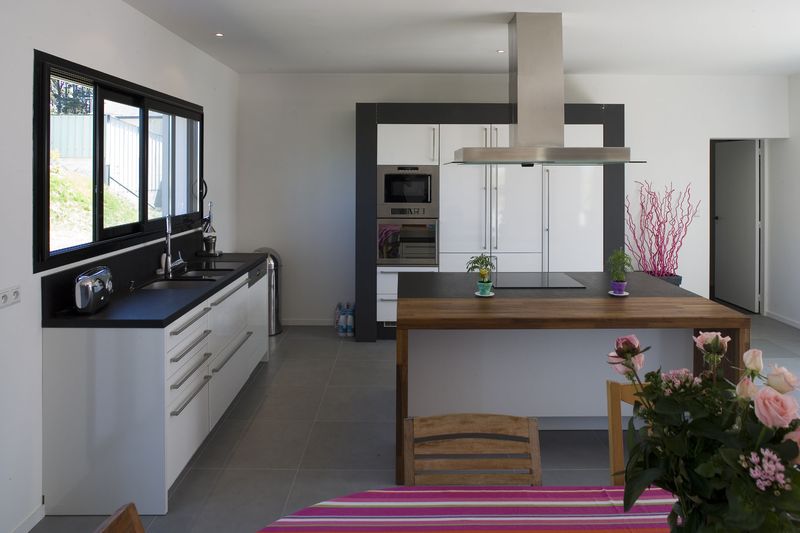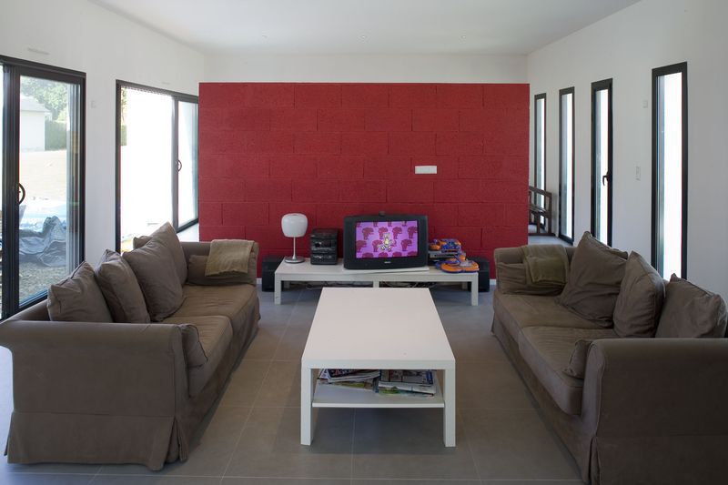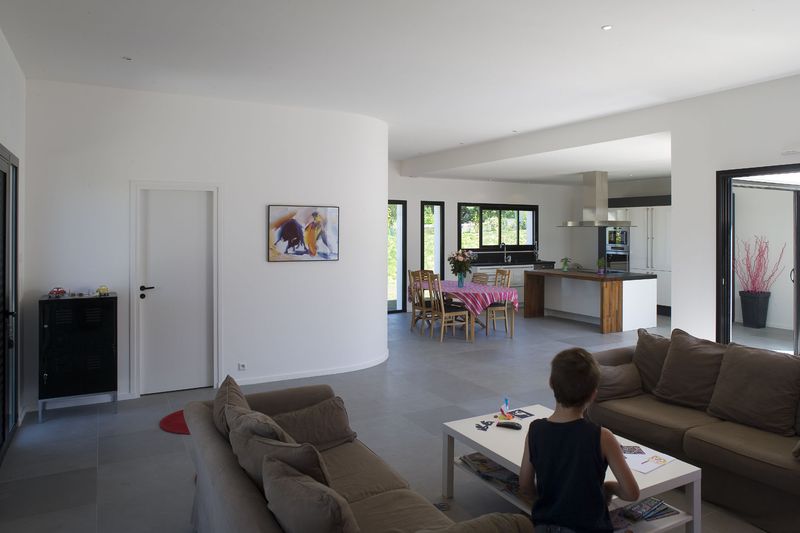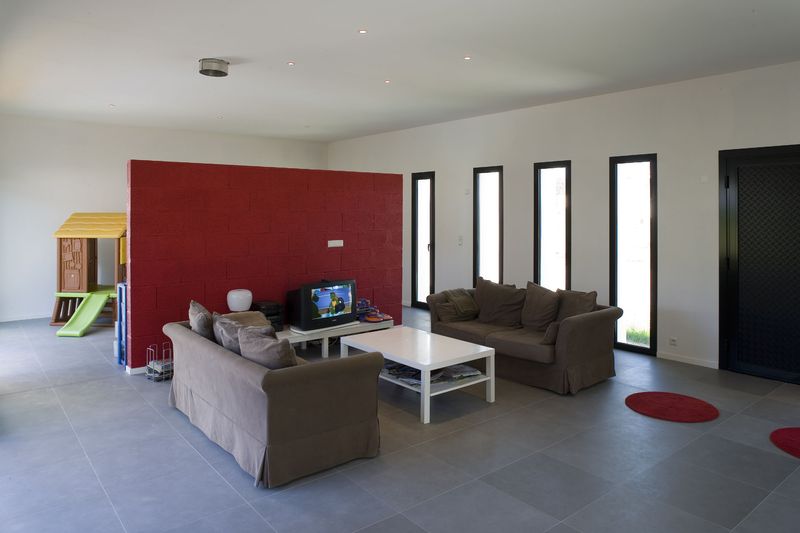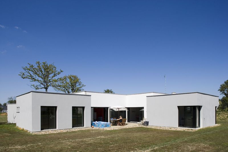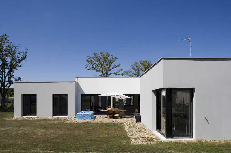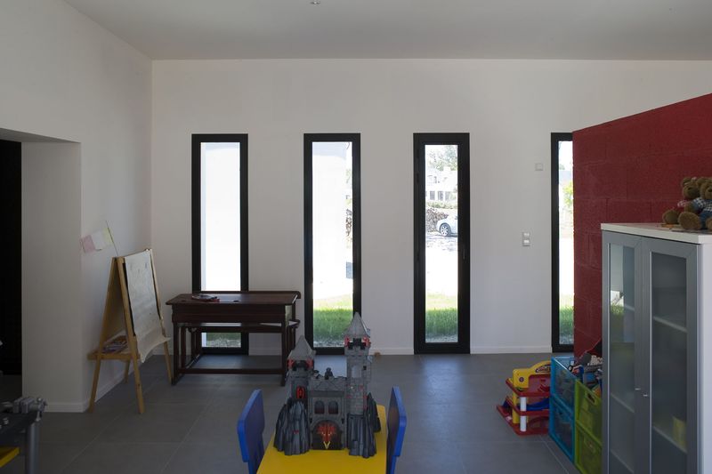 De part et d'autre du volume central en "L" abritant l'espace de vie, 2 volumes sont consacrés aux chambres, l'un pour les parents, l'autre pour les enfants.