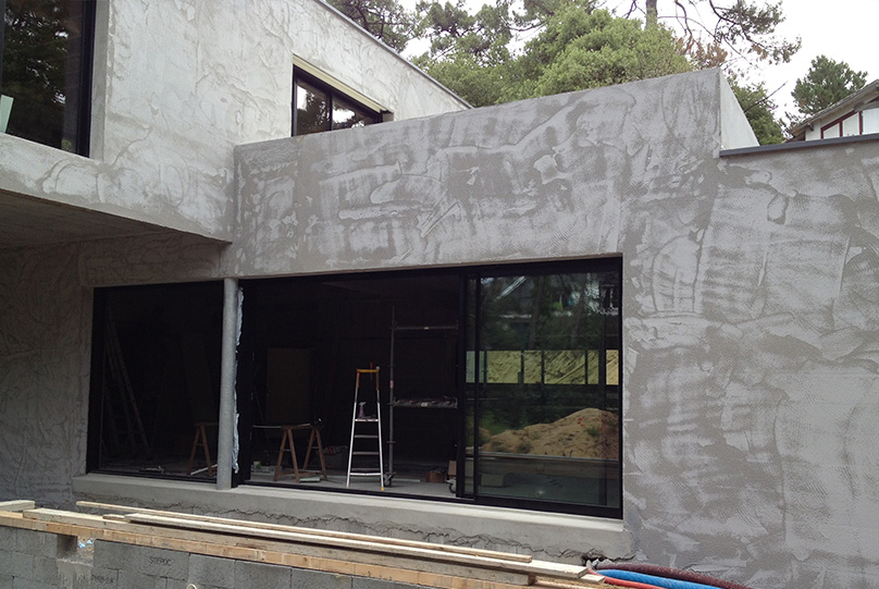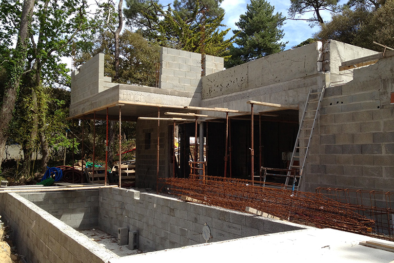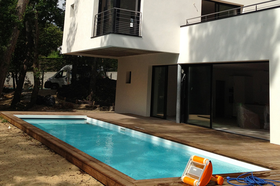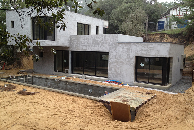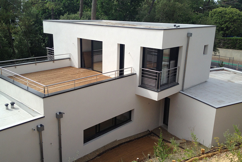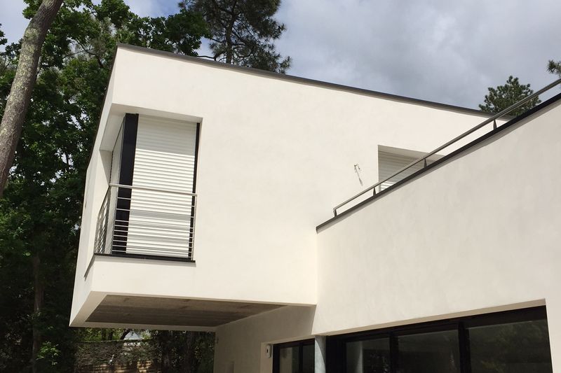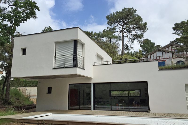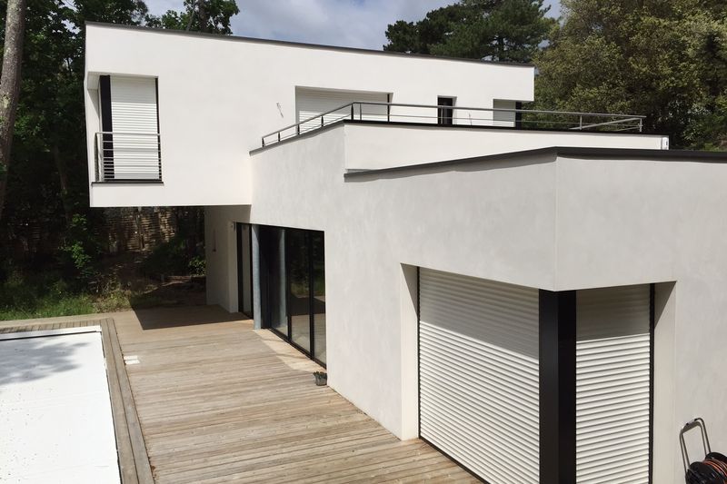 Intégration d'une villa moderne au sens architectural affirmé, dans une dune ou les pins parlent et protègent ce lieu serein.
