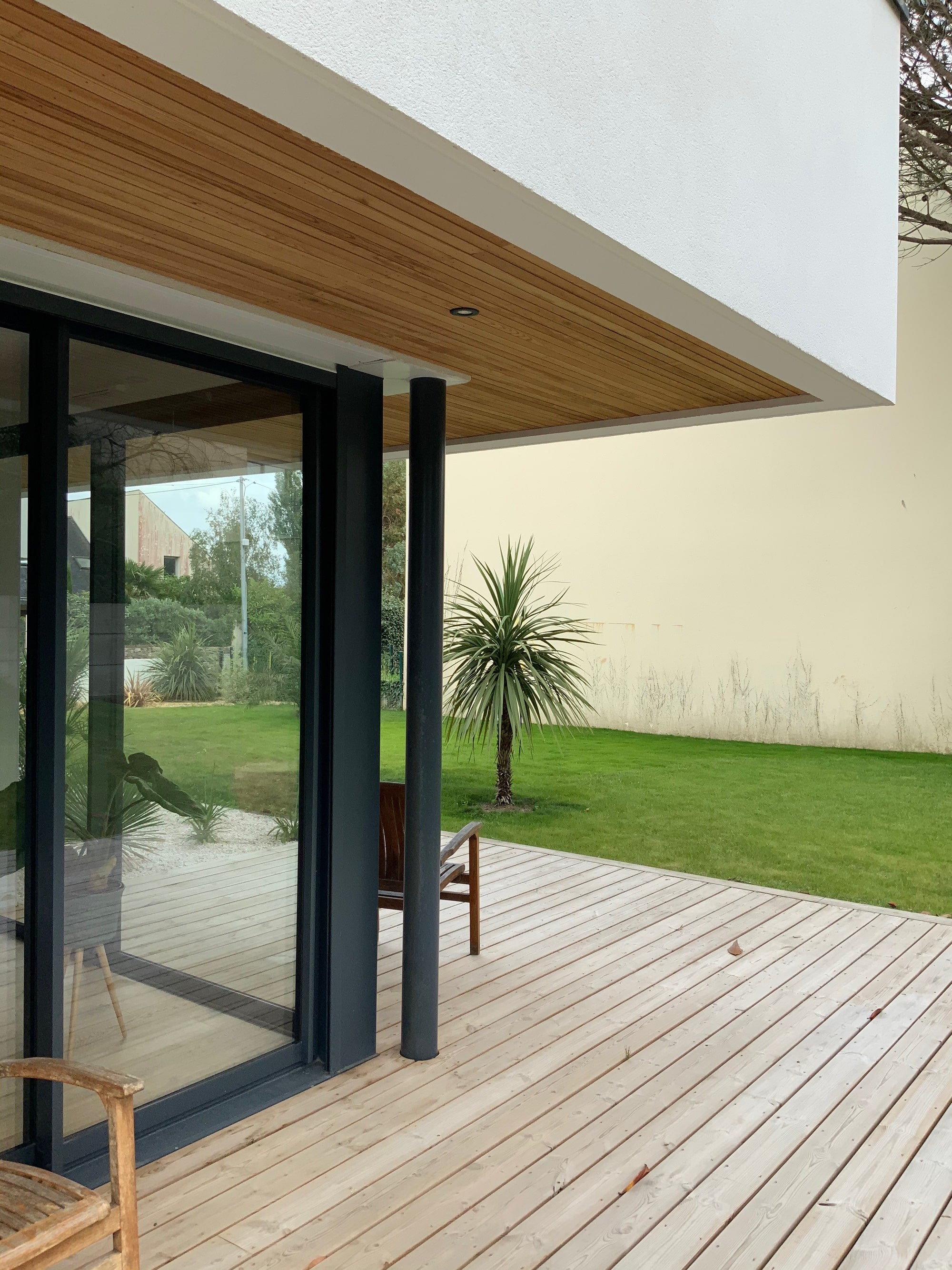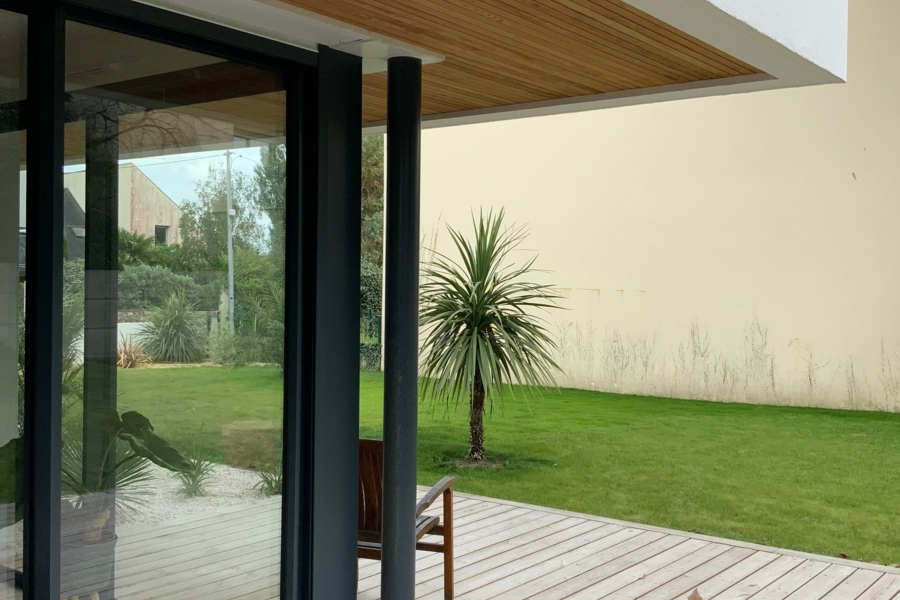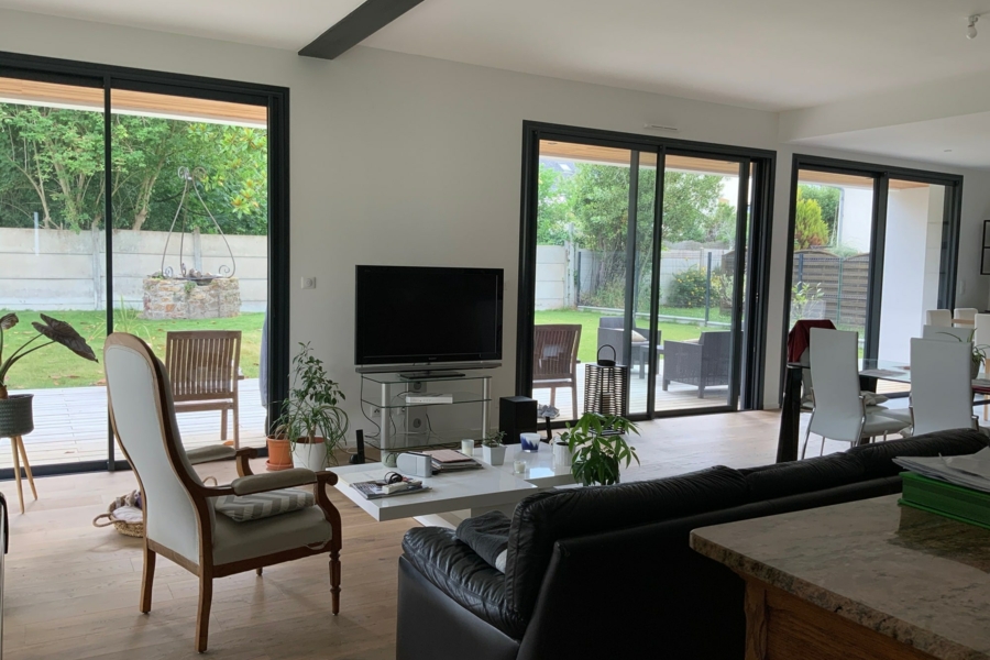 Architecture moderne pour cette pétillante famille. Les Volumes sont simples, lumineux et ouverts largement sur l'extérieur ou des terrasses bois font un agréable lien avec le jardin.